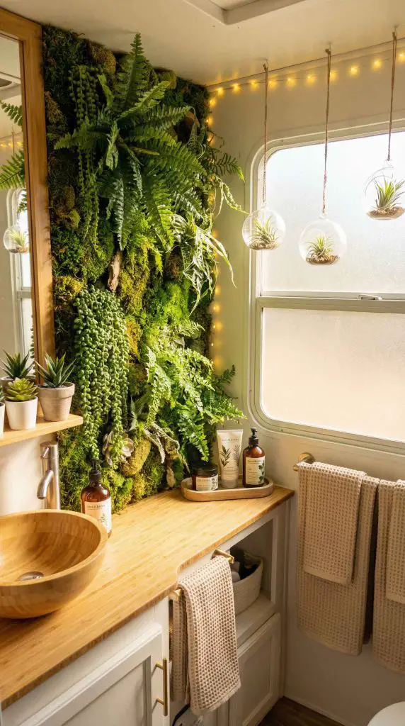 Choose low-maintenance plants that thrive in humid bathroom conditions like pothos, spider plants, or ferns. The vertical arrangement maximizes space efficiency while creating dramatic visual impact. This design element is particularly effective for RVers who travel to urban areas, bringing a touch of nature wherever you park.