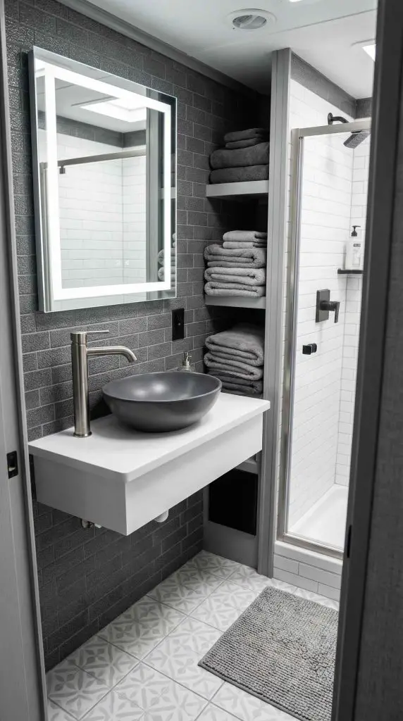 PRO TIP: Use at least three different shades of gray to create depth—light walls, medium-toned accessories, and darker accents. Incorporate various textures like smooth tiles, fluffy towels, and matte fixtures to add visual interest to the monochromatic palette.