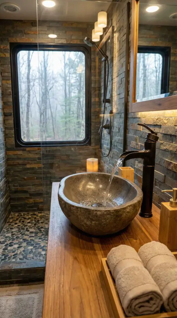 A waterfall faucet transforms the simple act of washing hands into a meditative experience. The gentle cascade of water creates soothing visual and auditory elements that enhance the spa atmosphere. Paired with a vessel sink on a wooden countertop, this combination brings natural zen energy to your RV bathroom. Natural stone accents complete the modern spa design.