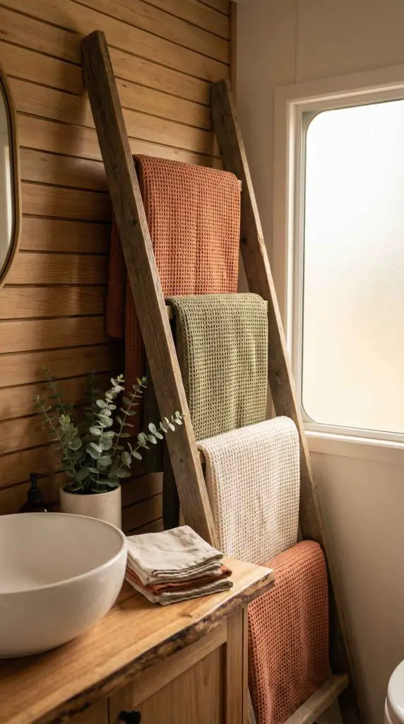 Turkish spa towels in earthy colors bring authentic spa luxury to your RV bathroom while taking up less storage space than traditional terry cloth. These lightweight, quick-drying textiles are perfect for RV life—they fold compactly, dry quickly, and become softer with each wash. A decorative ladder towel rack displays them beautifully while serving as functional storage. The rustic modern design creates a warm, cozy atmosphere.