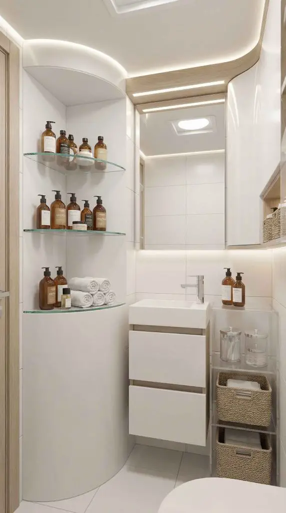 Corner glass shelves utilize often-wasted space while maintaining an open, airy feel that’s essential in small bathrooms. The clear shelving units seem to disappear, keeping the focus on your beautifully organized spa products. This minimalist floating storage solution provides practical display space without visual heaviness. Bright lighting enhances the clean modern aesthetic.