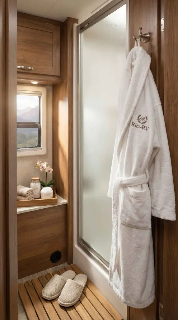 A plush white bathrobe hanging on a stylish hook and spa slippers on a coordinating mat create an instant hotel bathroom feel. These simple additions transform your post-shower routine into a pampering ritual. The luxury textures and hotel-inspired setup remind you to slow down and treat yourself well. This spa-like setup signals that your RV bathroom is a place for self-care and relaxation.