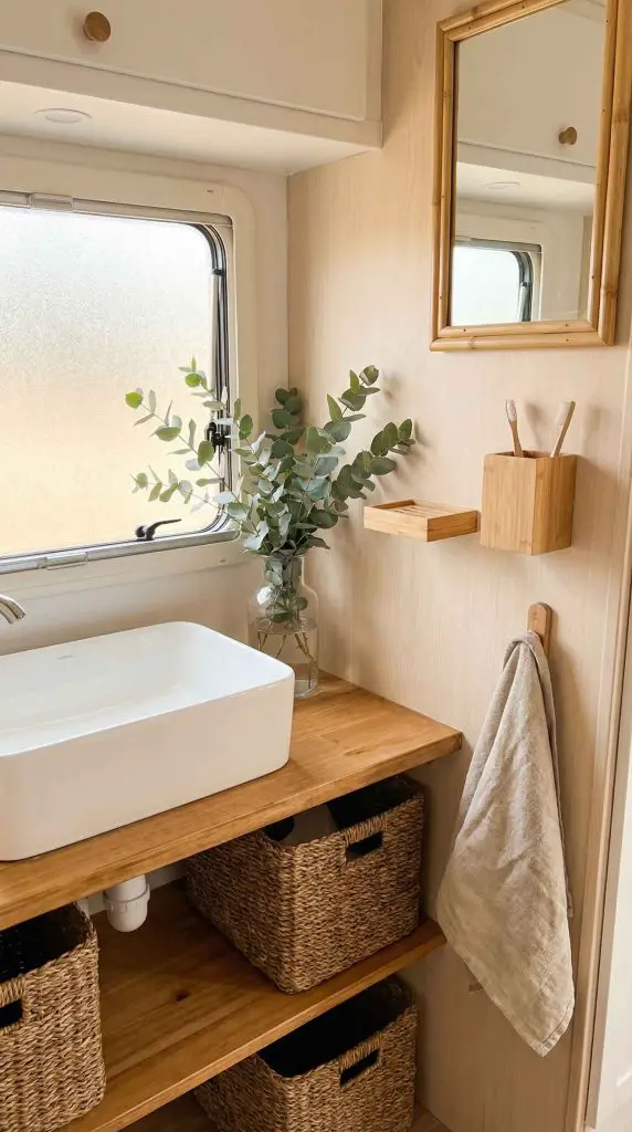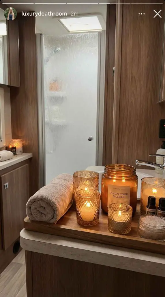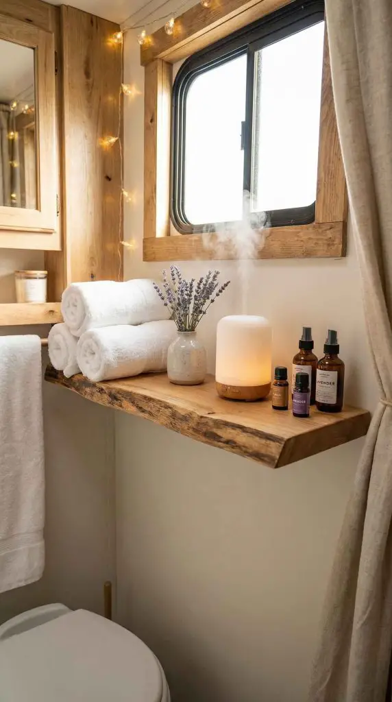 The floating shelf design keeps floor space clear while providing practical storage for your spa essentials. Choose a diffuser designed for small spaces to avoid overwhelming the compact RV bathroom with too much fragrance. Rolled towels hotel-style not only look elegant but also fit more efficiently in tight spaces than folded towels.