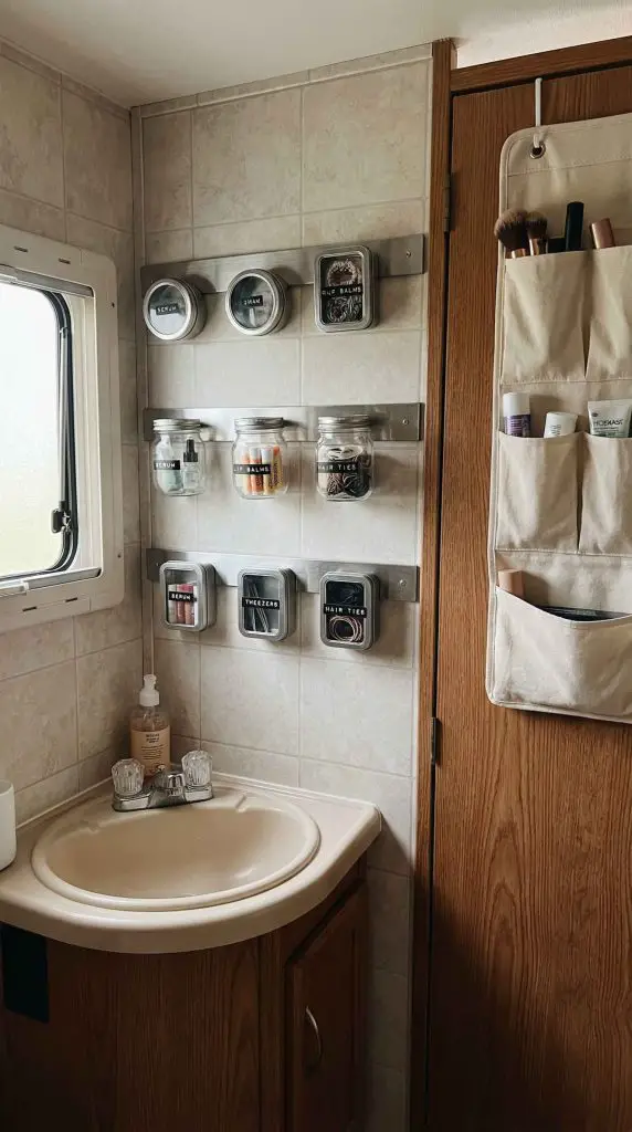 Repurposing magnetic spice racks for cosmetics and toiletries is a creative space-saving hack that maximizes wall space. Wall-mounted metal strips hold small magnetic containers that keep beauty products organized and easily accessible. This innovative storage solution is perfect for tight RV bathrooms where every inch counts. The organized beauty products remain visible and accessible without cluttering counters.