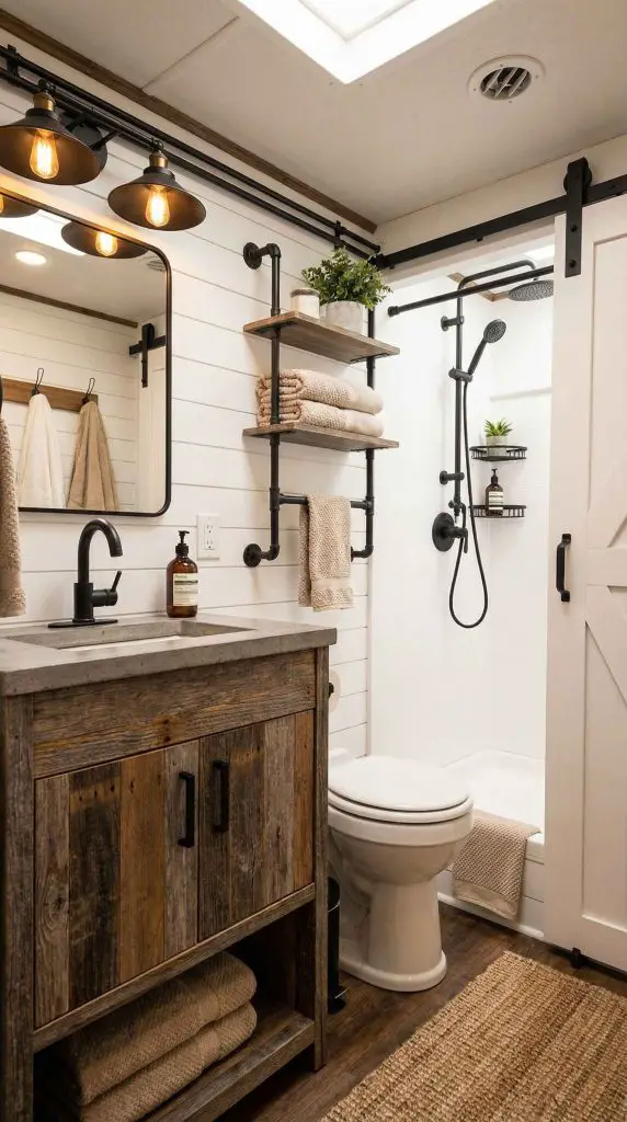 Peel-and-stick shiplap panels make installation easy and RV-friendly—no permanent modifications required. The painted wood texture adds dimension without overwhelming the space. This style works particularly well for RVers who want a homey, comfortable feel rather than a stark modern spa aesthetic.