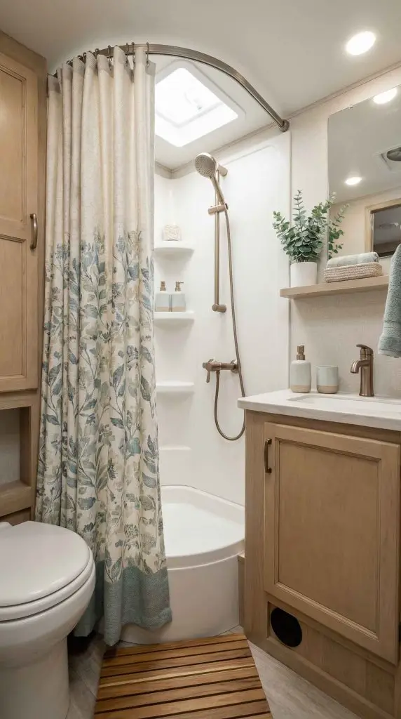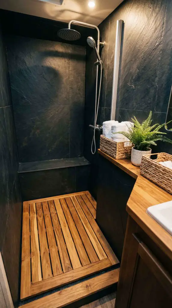 A non-slip teak wood bath mat brings spa resort style directly to your RV bathroom floor. The natural wood texture feels amazing underfoot and provides excellent water drainage. This organic material naturally resists mold and mildew while adding warmth and natural beauty. The wet room design approach common in luxury spas translates perfectly to RV bathrooms.