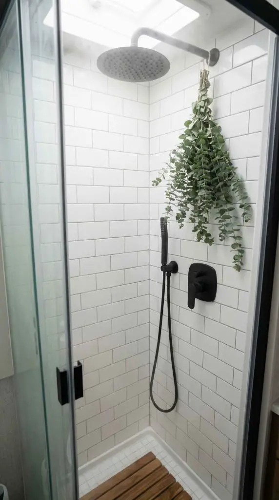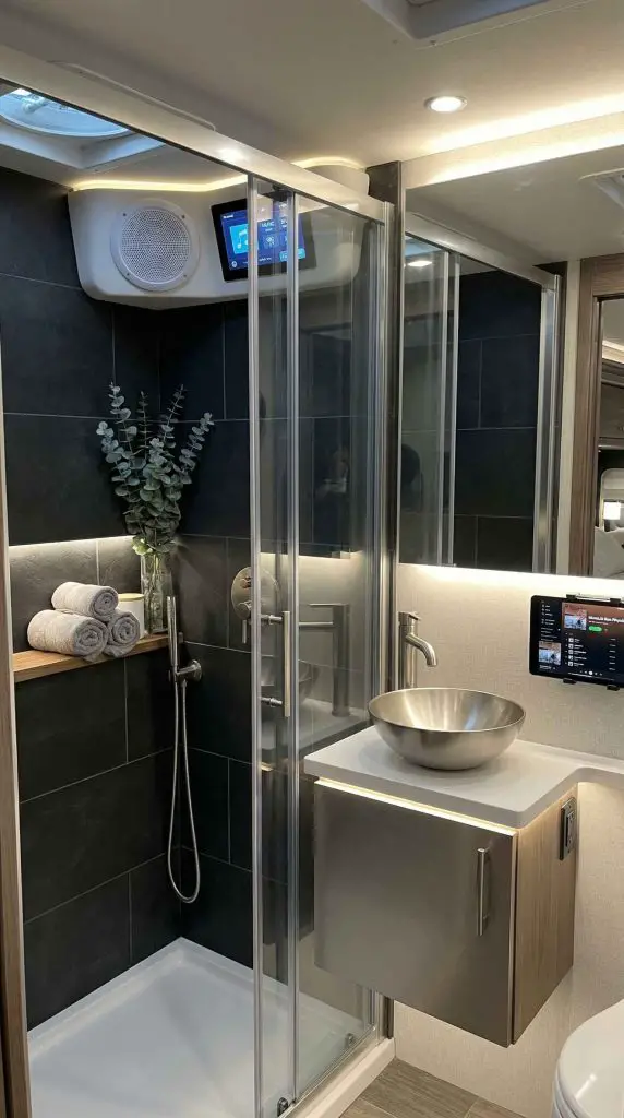 Installing a rainfall showerhead is one of the most impactful upgrades you can make for creating a true spa experience in your RV. The gentle cascade of water mimics natural rainfall and provides a more luxurious, relaxing shower than traditional spray patterns. Glass enclosures keep the space feeling open while containing moisture effectively. Hang fresh eucalyptus from the showerhead for an aromatic steam room effect.