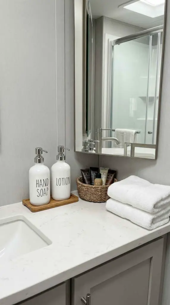 Matching white ceramic soap dispensers create a hotel bathroom aesthetic that looks professionally designed. Decanting products into coordinated containers immediately upgrades the visual appeal of your countertop. This organized counter approach eliminates the visual chaos of mismatched product bottles. The luxury toiletries presentation makes everyday items feel special and intentional.