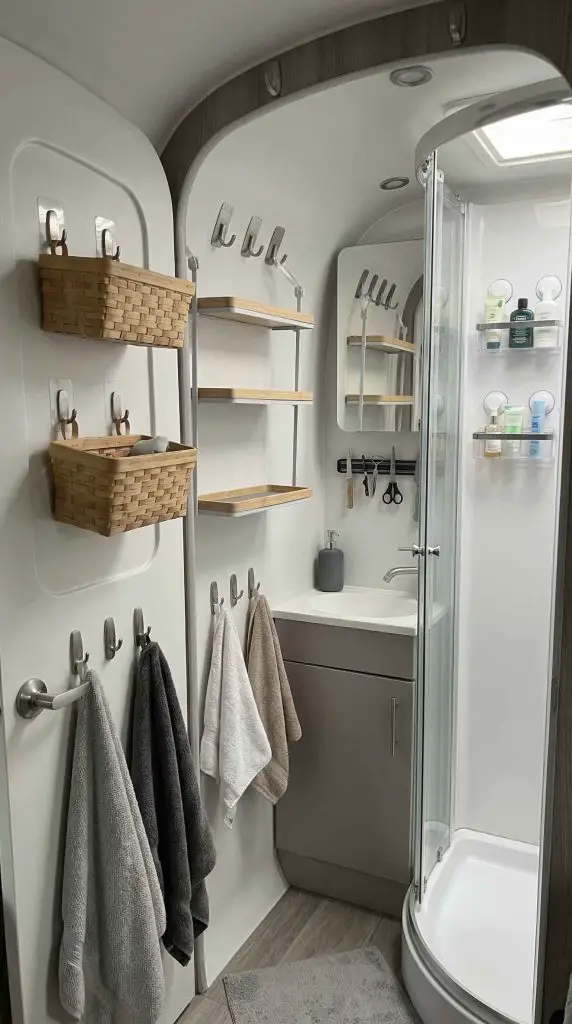 Command hooks provide smart wall organization without damaging RV surfaces. Multiple towel hooks at different heights maximize vertical space while keeping towels accessible and organized. These no-damage hanging solutions are perfect for renters or those who want flexibility to change arrangements. The efficient space usage ensures every wall area serves a purpose.