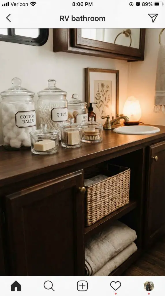 Over-the-door organizers and hanging storage pockets maximize vertical space that often goes unused in RV bathrooms. This efficient organization system keeps essentials accessible while maintaining clear countertops for a spa-like aesthetic. White and clear containers create visual cohesion and make it easy to see what you have at a glance. Every inch of vertical space becomes functional storage.