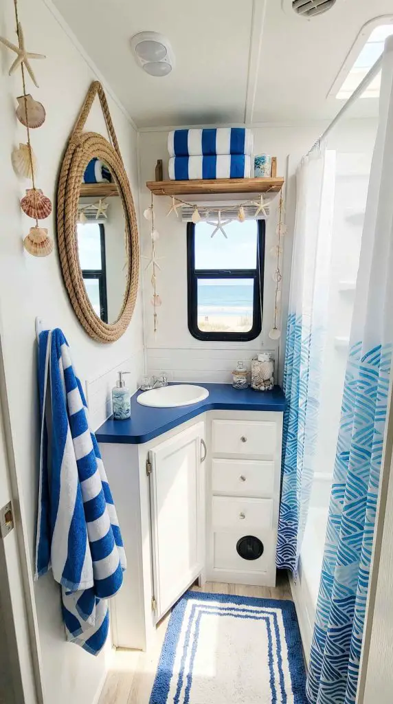 Ocean-inspired colors bring a calming, beachy vibe to your RV bathroom that instantly transports you to a seaside resort. Soft blues paired with crisp whites create a fresh, airy atmosphere that opens up even the tiniest spaces. Add nautical touches like rope-wrapped mirror frames, striped towels, and carefully curated seashell displays for authentic coastal charm without going overboard on the theme.