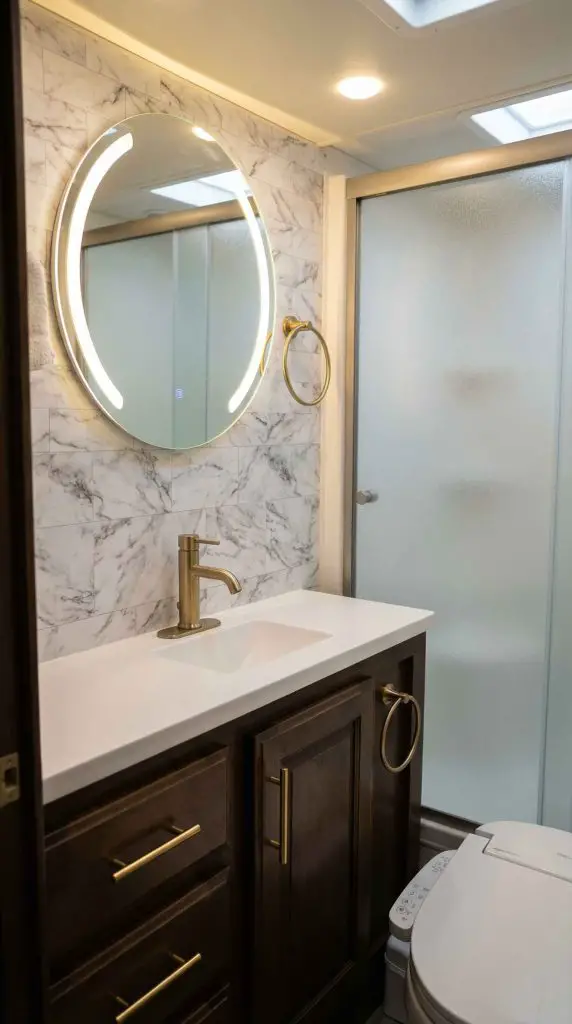 Peel-and-stick marble tile creates an upscale look without the weight or expense of real stone. The classic marble pattern adds sophistication and elegance to your RV bathroom, while gold fixtures provide warm, luxurious contrast. This combination mimics high-end hotel bathrooms and creates a sense of opulence in even the most compact spaces. LED-lit mirrors enhance the glamorous atmosphere while providing practical task lighting.