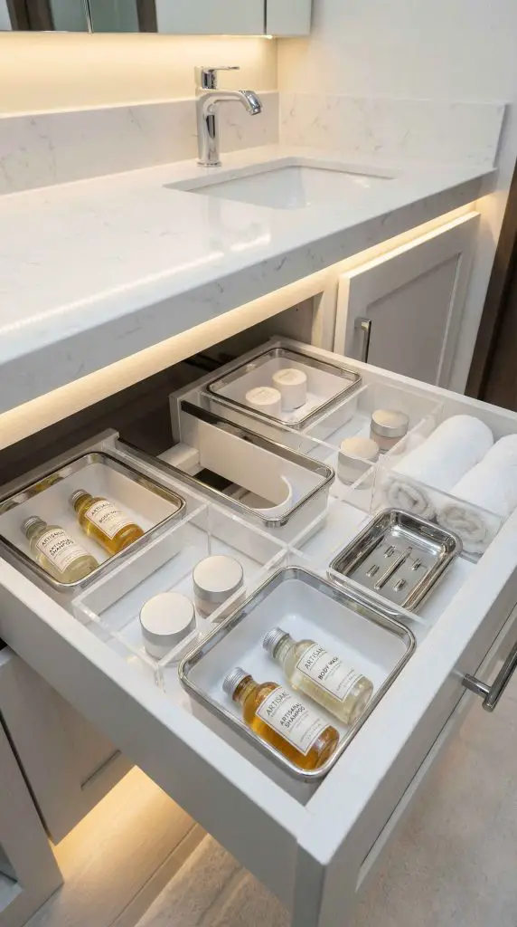 Group similar items together—skincare in one section, makeup in another, tools in a third—to create an intuitive system that saves time during your daily routine. Chrome and white storage solutions complement virtually any design style while keeping the focus on organization rather than decorative elements. Luxury toiletries neatly arranged look like a high-end boutique display.