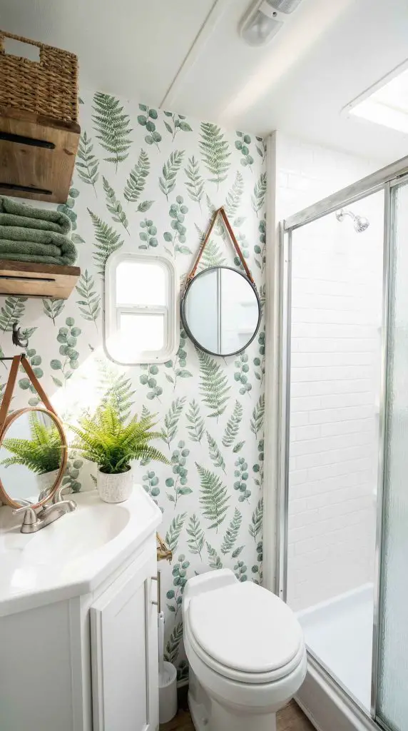 Choose patterns with plenty of negative space to avoid overwhelming a small bathroom—large-scale botanical prints work better than busy, detailed patterns. The wallpaper creates instant impact and can completely transform the room in just an afternoon. Pair with white fixtures and natural wood accents to let the pattern shine as the star of the space.