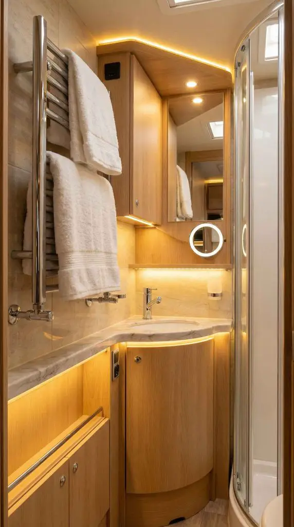 A heated towel rack is the ultimate luxury upgrade that transforms your RV bathroom into a five-star hotel experience. Fluffy white towels warmed to perfection create an indulgent experience that makes every shower feel special. The chrome finish adds elegant sophistication while the compact, space-saving design fits perfectly in RV bathrooms. Warm ambient lighting enhances the cozy, spa-like atmosphere.