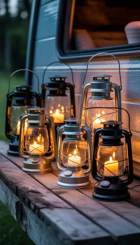 These lanterns come in different shapes and materials like metal or wood. Choose ones that match your camper’s vintage look. They are easy to move and perfect for creating a relaxing mood at night.