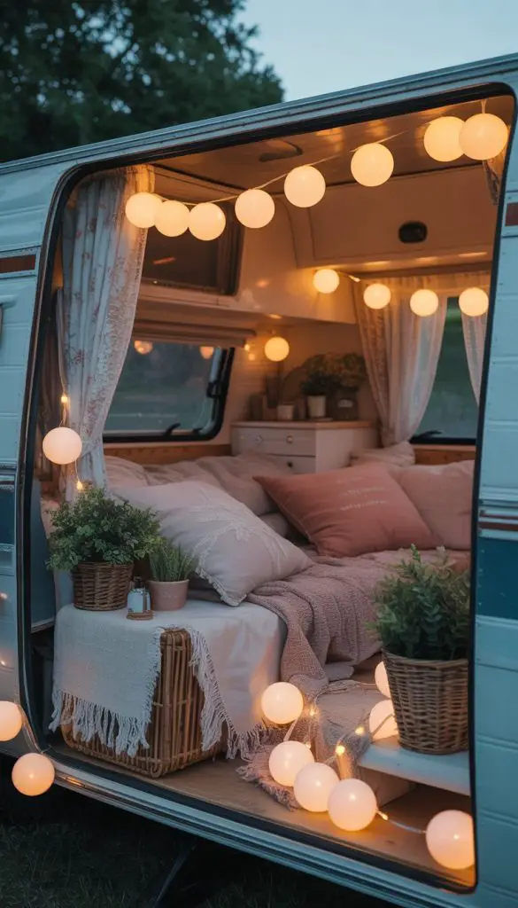 Twinkle lights are a simple way to add charm to your camper. Draping them over windows creates a soft glow that makes your space feel cozy. They also highlight the natural light during the day.
