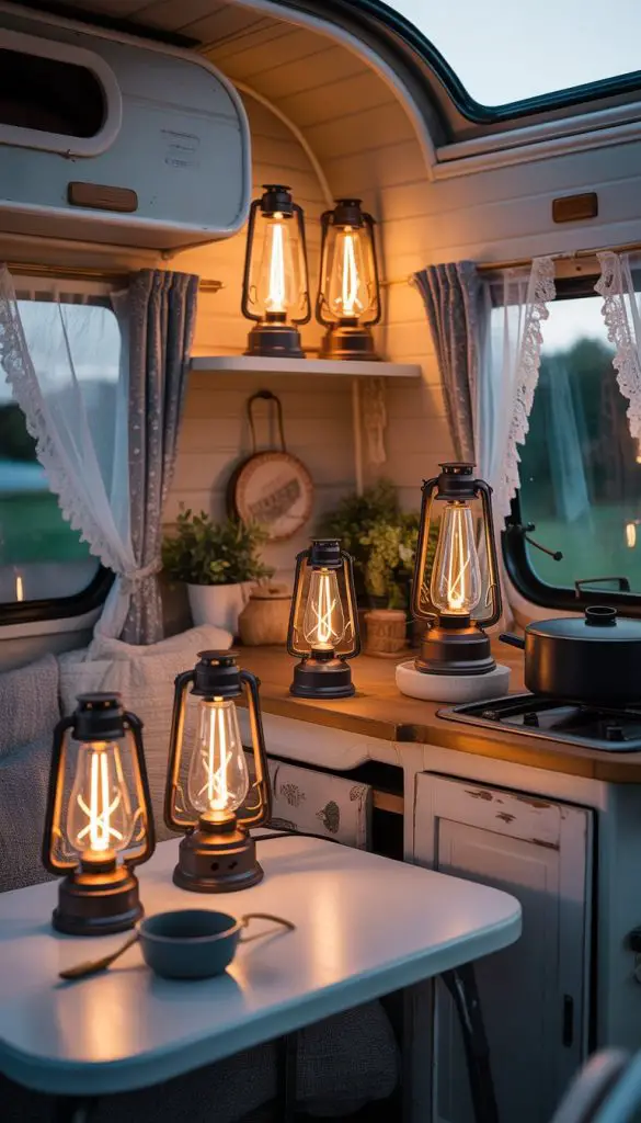 These lamps bring a warm, soft glow that creates a cozy atmosphere. You can place them on shelves, tables, or hang them inside your camper for a classic touch.