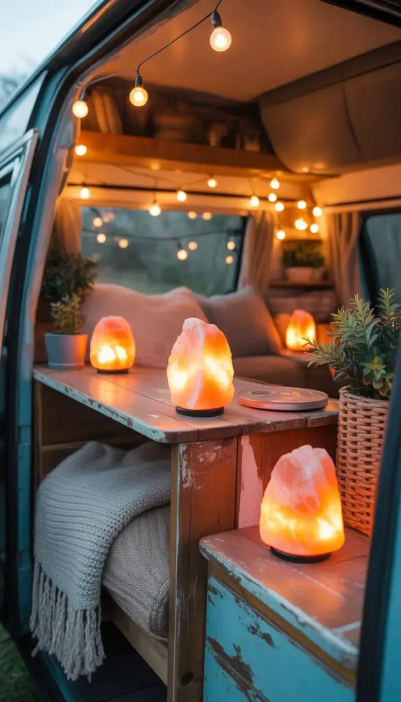 Himalayan salt lamps add a soft, warm glow to your camper. Their pink and orange tones create a calm and relaxing space. They are perfect for reading or unwinding after a day outside.