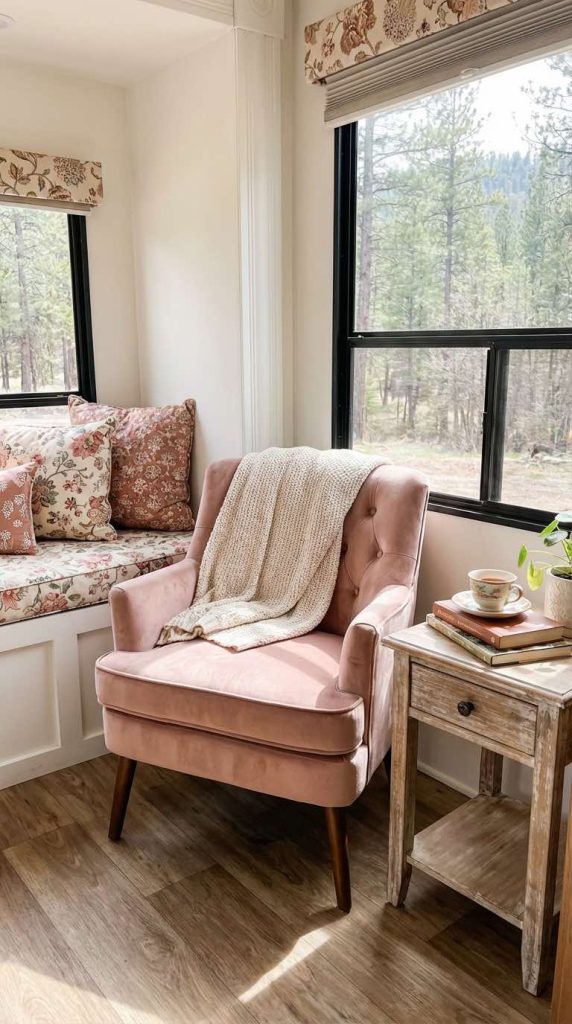 Carve out a dedicated relaxation space by creating a cozy reading nook with a plush armchair or window seat piled with cushions. Choose a velvet chair in blush pink or another soft feminine color that invites you to curl up with a good book. Add a soft throw blanket, a small side table for your tea or coffee, and good reading light. This personal retreat becomes your sanctuary for quiet mornings, relaxing evenings, or rainy day contentment during travels.