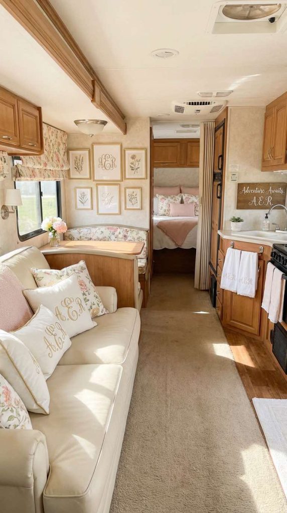Layer your RV seating areas with an abundance of decorative throw pillows in various textures, patterns, and feminine colors. Mix velvet, faux fur, sequins, embroidered, and linen pillows in coordinating shades of blush, lavender, cream, and soft gray. This simple decorating technique instantly elevates the comfort and style of your space while allowing for easy seasonal changes. Pillows provide both visual softness and physical comfort, making your RV feel more like a cozy home.