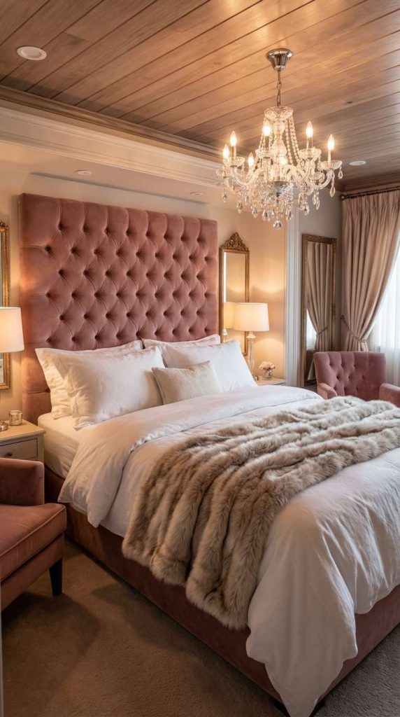 PRO TIP: DIY your own lightweight tufted headboard using foam board, batting, velvet fabric, and decorative buttons. Attach it securely with heavy-duty velcro strips that can be easily removed when needed. Add a crystal chandelier or elegant wall sconces on either side to create a romantic, symmetrical bedroom design that feels like a boutique hotel.