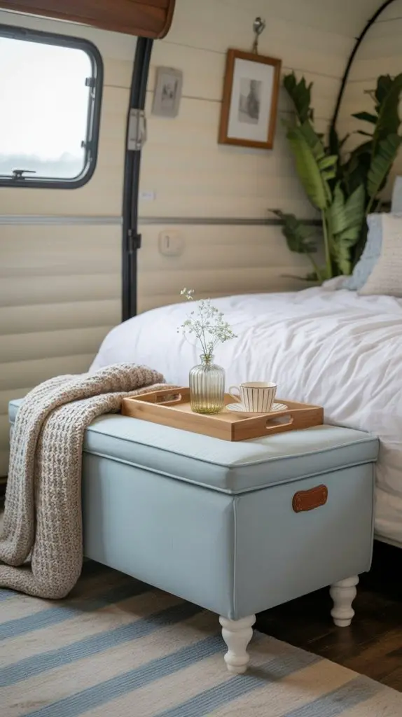 Every shabby chic camper needs stylish, hidden storage for odds and ends. A vintage-style metal tonneau bin, with its rectangular shape and hinged lid, is both practical and picturesque. Often adorned with French labels or a chippy paint finish, these bins are perfect for storing extra throw blankets, magazines, board games, or even dry pantry goods.