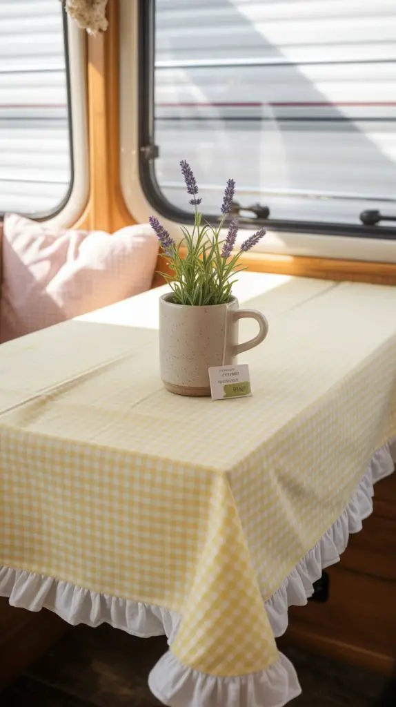 A tablecloth instantly disguises a standard RV table and makes mealtimes feel more special. It’s also practical, protecting the surface from spills and scratches. When not in use, the soft fabric folds away easily, or you can style it loosely draped for a more relaxed, “lived-in” look.