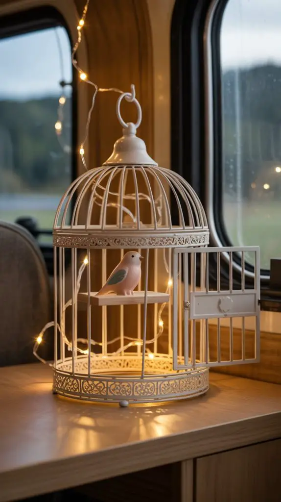 A small, ornate white or gold birdcage is a classic shabby chic decorative accent. Instead of housing a bird, use it as a unique display piece. Place a battery-operated fairy light string inside for a magical glow, or fill the bottom with moss and display a small collection of porcelain birds or dried flowers.