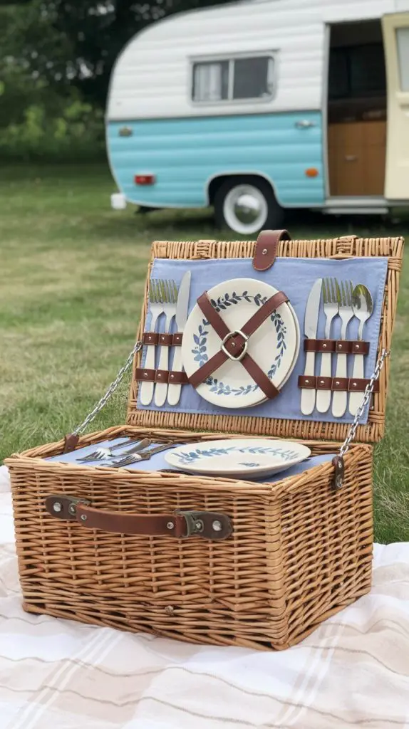 Embrace the art of picnicking with a classic wicker picnic basket that has built-in storage for ceramic plates, cutlery, and glassware. This accessory isn’t just for outdoor meals; it serves as beautiful, ready-to-go storage for your best dishware inside the camper. The natural wicker texture complements the rustic elements of shabby chic perfectly.