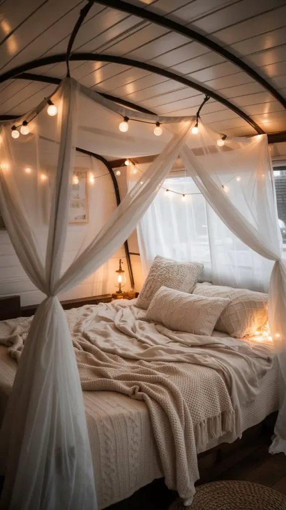 Imagine drifting off to sleep under a soft, flowing canopy in your camper bedroom. This idea uses a simple, DIY curtain rod arched over the head of the bed, from which hangs a length of sheer, ivory mosquito netting or lightweight muslin. The fabric is gathered loosely and drapes gracefully down to the floor on either side of the bed, creating an intimate and romantic focal point that draws the eye upward and makes the small space feel larger.