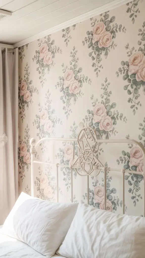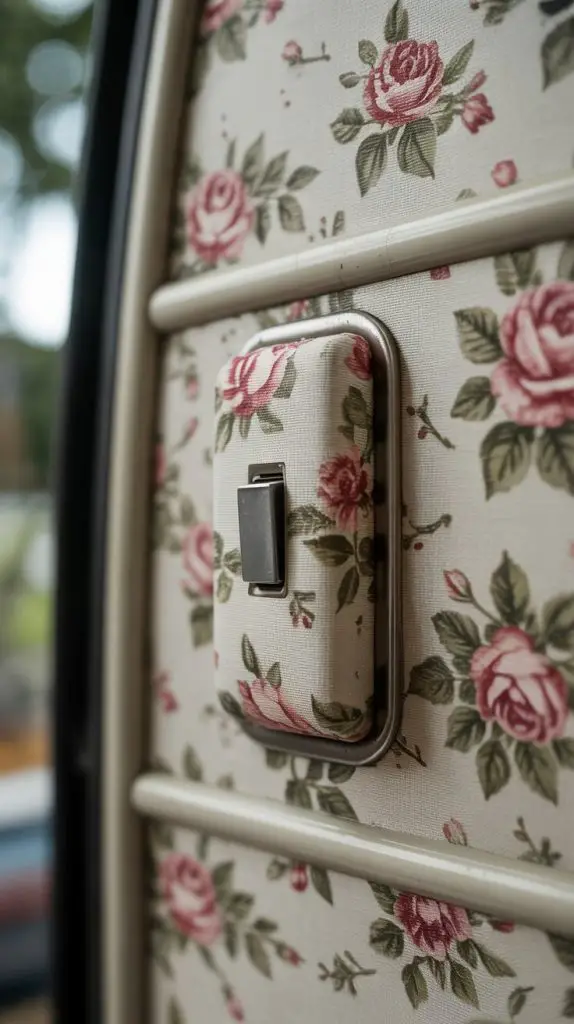 Infuse your camper with a touch of romantic botanicals by creating a subtle floral accent wall. Instead of bold, modern wallpaper, this wall features a soft, off-white background with a faint, trailing pattern of pale pink roses and green eucalyptus leaves. The pattern is delicate and almost faded, as if it’s been there for decades, perfectly capturing the shabby chic ethos.