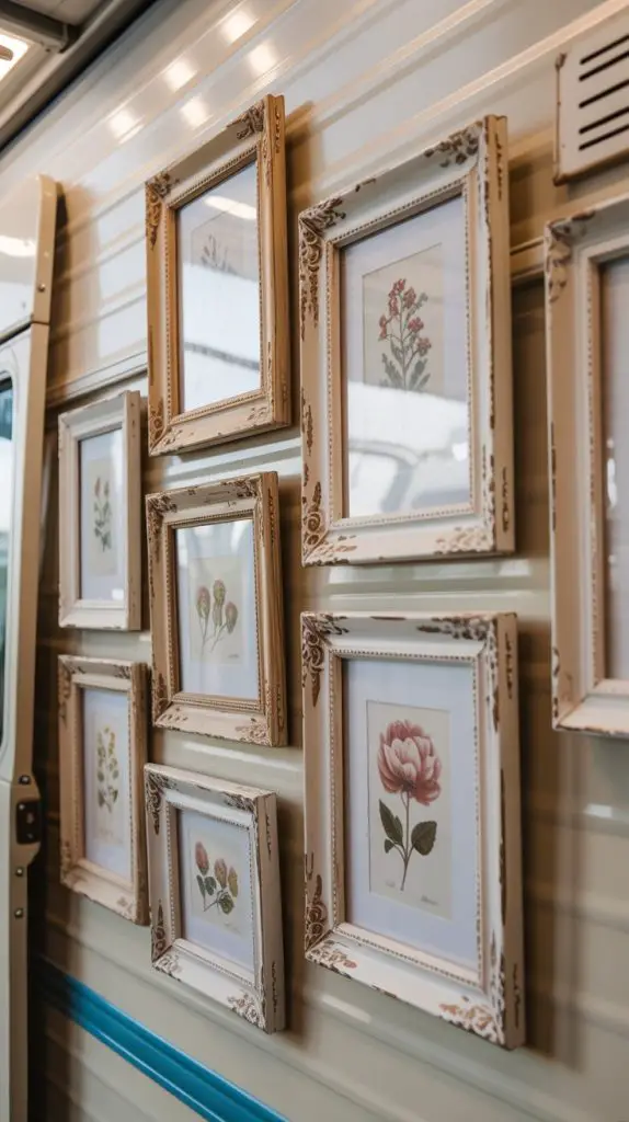 Create a stunning focal point by dedicating one wall of your camper to a gallery of mismatched, vintage-inspired frames. The frames are all in varying shades of white, cream, and pale gray, with intricate carvings and different levels of distressed finishes. Inside the frames, you’ll find a curated collection of delicate botanical prints, vintage postcards, and faded floral illustrations, all with soft, muted colors that complement the shabby chic palette.