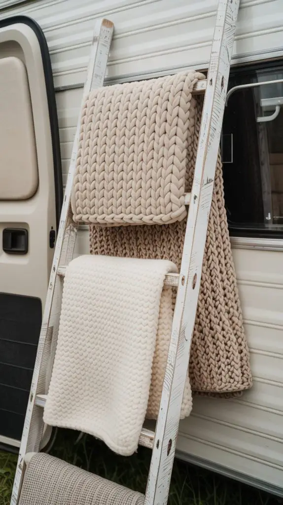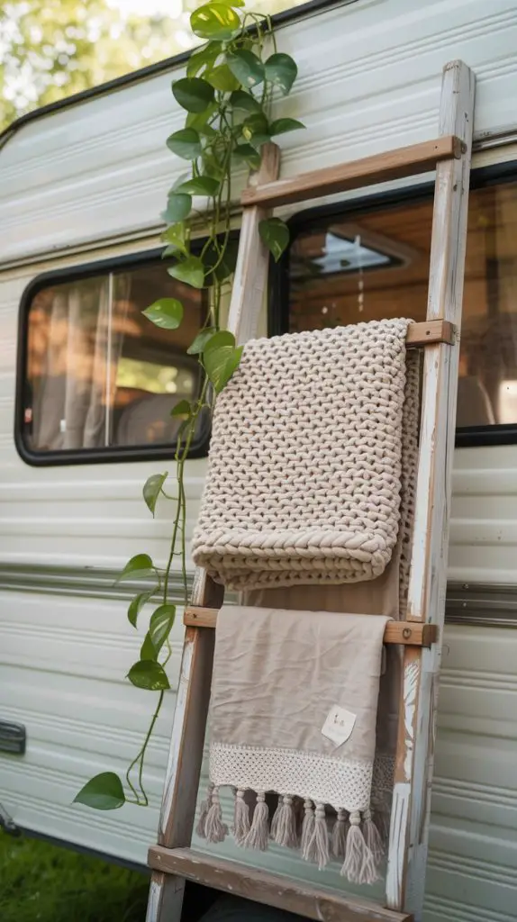 PRO TIP: If you’re handy, build your own blanket ladder from pre-cut dowels and 1×2 lumber. You can customize the height and finish to perfectly match your camper’s decor. It’s an easy, inexpensive DIY project with a big payoff.
