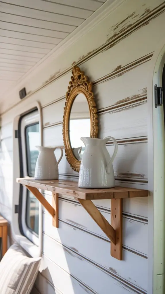 This wall provides the perfect textural backdrop for other shabby chic elements, like a hanging, distressed-wood shelf holding white ceramic vases or a large, ornate mirror with a faded gold frame. The horizontal lines of the shiplap can also help to visually widen a narrow space, making your camper feel more open and airy while staying true to the style’s rustic roots.