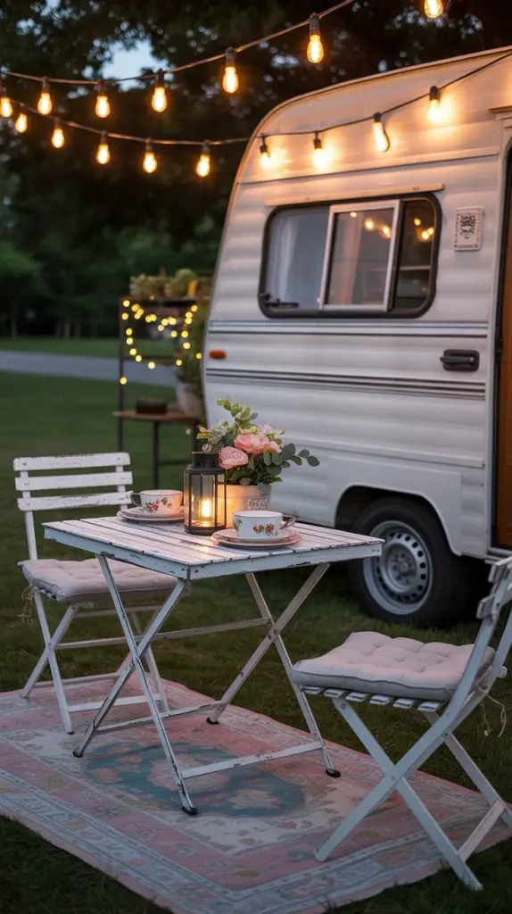 Extend the shabby chic charm to your campsite with a beautifully appointed outdoor sitting area. A small, wrought-iron bistro table with a scrolled base and a chipped white finish is set for two with mismatched china: a floral-patterned plate and a simple white cup and saucer. The true magic comes from the lighting—a string of Edison bulbs is draped above, and a vintage-style lantern with a flickering LED candle sits on the table.