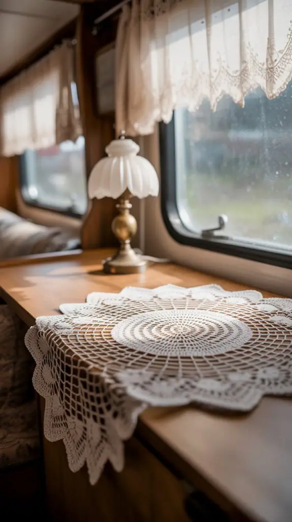 Drape your camper in the timeless elegance of lace and crochet. This idea focuses on the small, textural details that make a big impact. A beautifully crocheted, off-white doily rests under a small lamp on a side table, its intricate pattern casting delicate shadows. On the sofa back, a lace runner is draped gracefully, softening the lines of the furniture.