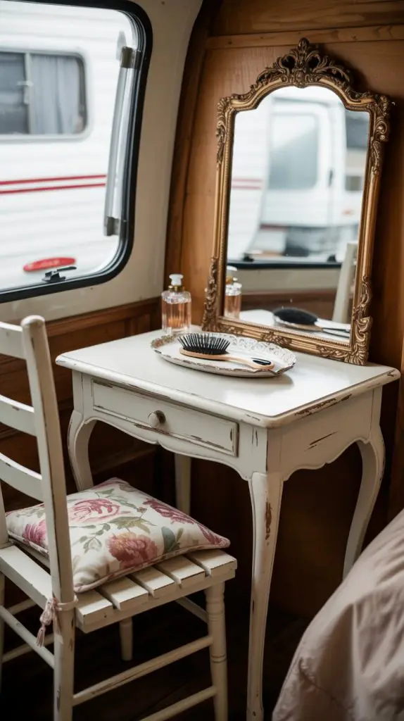 Every dreamy escape needs a spot for preparation and quiet reflection. This vanity corner is created using a repurposed, petite wooden desk with a gracefully curved front and peeling white paint that reveals glimpses of old, dark wood. The mirror above it isn’t a standard one; it’s an ornate, gilded frame with the mirror itself slightly spotted and aged, adding to the vintage character.