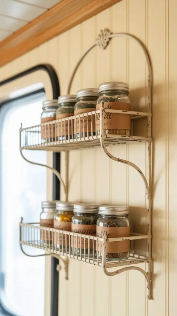 Mounted on the inside of a cabinet door or on a small section of wall, this rack keeps essentials within easy reach while turning a practical item into a decorative feature. The combination of the delicate metalwork and the simple glass jars adds a touch of vintage apothecary style to your camper’s galley.