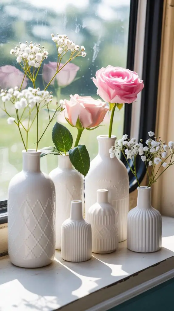 Display the timeless elegance of milk glass throughout your camper. Cluster a collection of these opaque white vases on a windowsill, shelf, or table. They come in various shapes—bud vases, compotes, and hobnail patterns—each holding a single, delicate bloom like a rose, a daisy, or a sprig of baby’s breath.