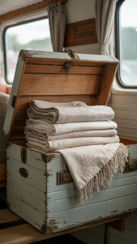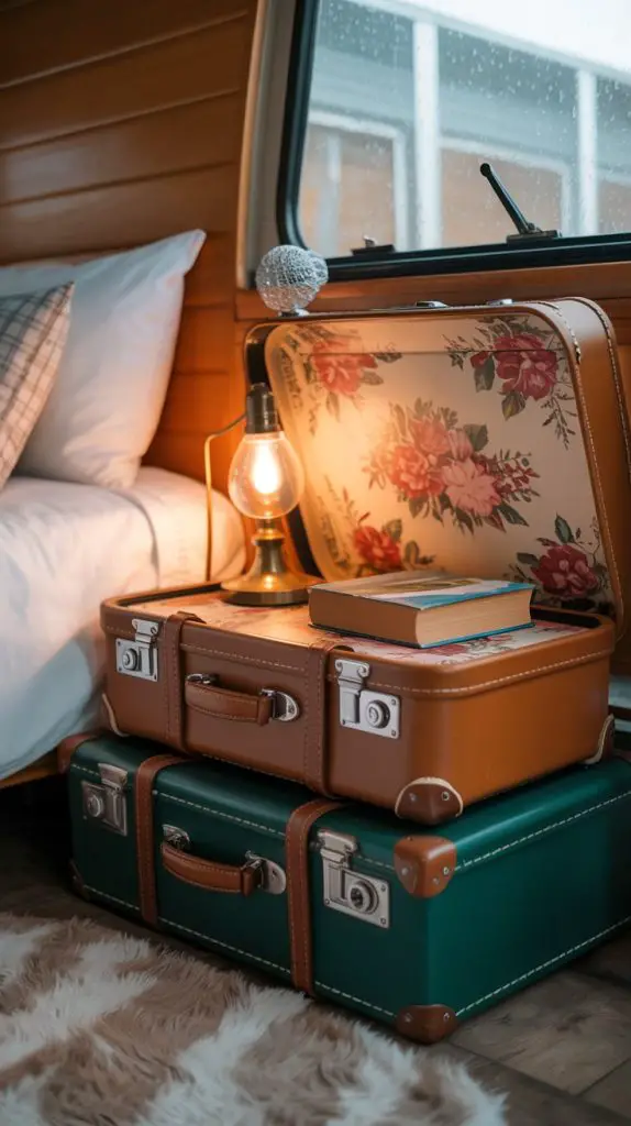 This idea is not only incredibly charming but also highly functional. The interior of the suitcases provides hidden storage for bedtime essentials, reading materials, or off-season clothing. It celebrates the nomadic spirit of RV life while perfectly adhering to the shabby chic aesthetic of repurposing and nostalgia.