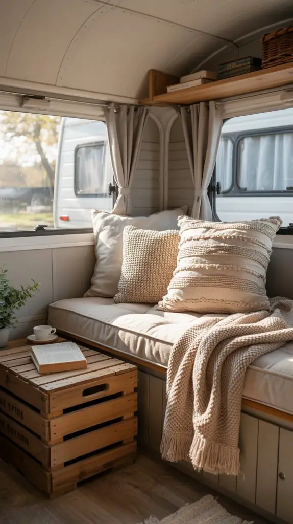Utilize a camper’s best feature—the window—to create a serene reading nook. This idea features a built-in bench seat fitted with a plush, custom-made cushion in a cream-colored linen. A stack of throw pillows in various sizes and textures—a ruffled one, a knitted one, a delicate floral one—invites you to sink in and relax. A soft, chunky knit throw is casually draped over the corner.