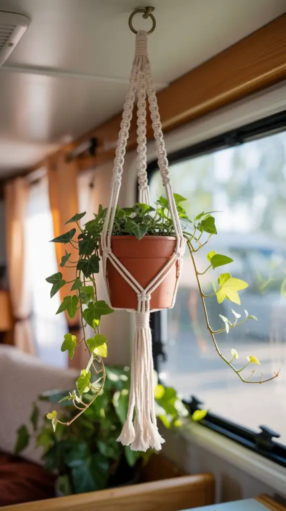 Hanging in a sunny spot near a window, it utilizes vertical space beautifully without taking up any precious counter or table space. The natural fiber of the macramé complements the textural, handmade feel of the shabby chic aesthetic.
