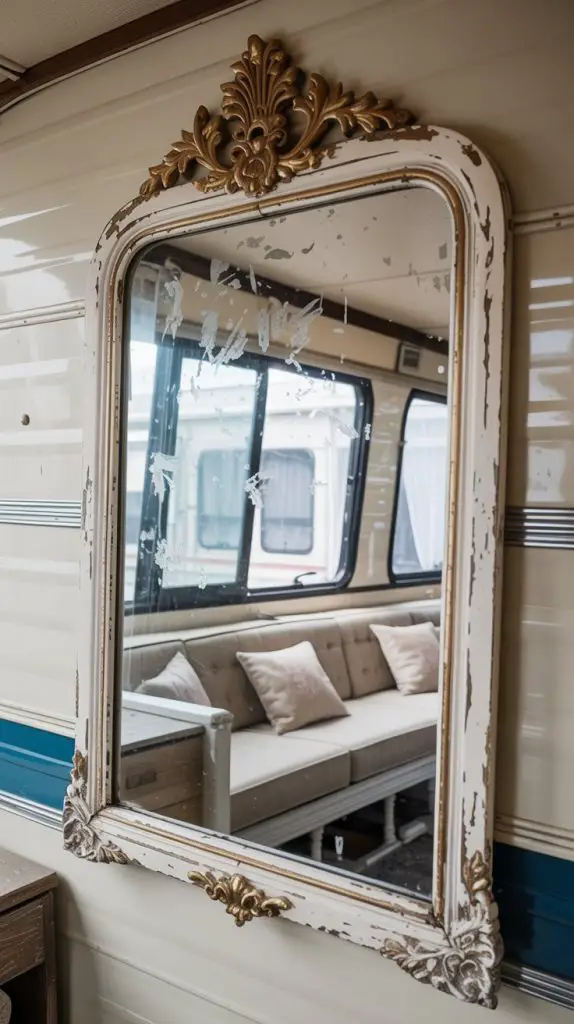 Make your small camper feel larger and brighter with a large, vintage mirror. The mirror’s frame is the star—wide and ornate, made of wood with a gilded or white finish that is heavily faded and chipped, revealing layers of paint and gesso underneath. The glass itself may have minor clouding or spots, which only adds to its authentic character.