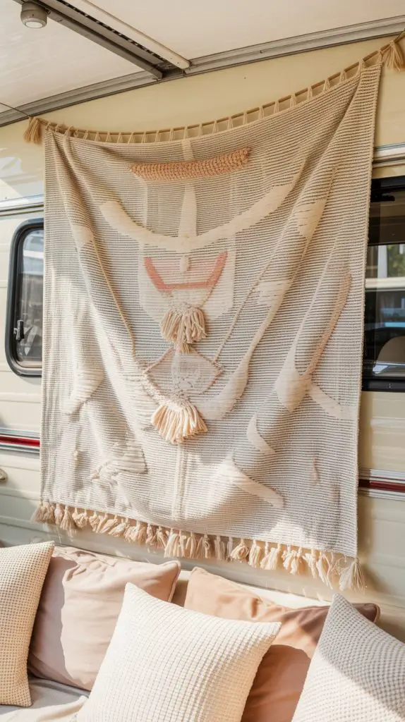Add a soft, bohemian texture to a large, blank wall with a woven tapestry. The tapestry features a subtle, abstract pattern in a muted color palette of cream, gray, and pale pink. Made of wool or cotton, it adds a layer of softness that fabricates the space, absorbing sound and making the camper feel even cozier.