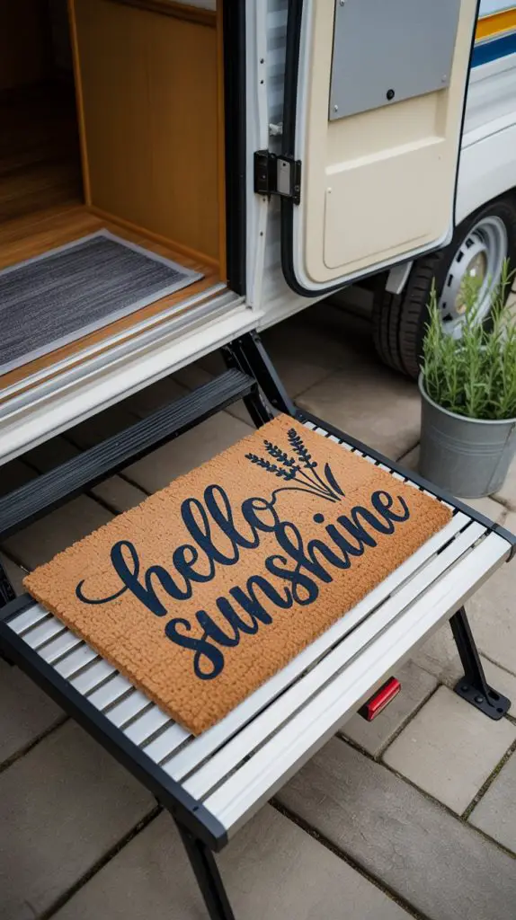 Set the tone right at your doorstep with a custom, stenciled welcome mat. The mat itself is a natural coir or a muted indoor-outdoor rug. Using outdoor paint, a welcoming phrase like “Hello Sunshine” or “Adventure Awaits” is stenciled in a elegant, cursive font, along with a simple floral motif like a wreath or a sprig of lavender.