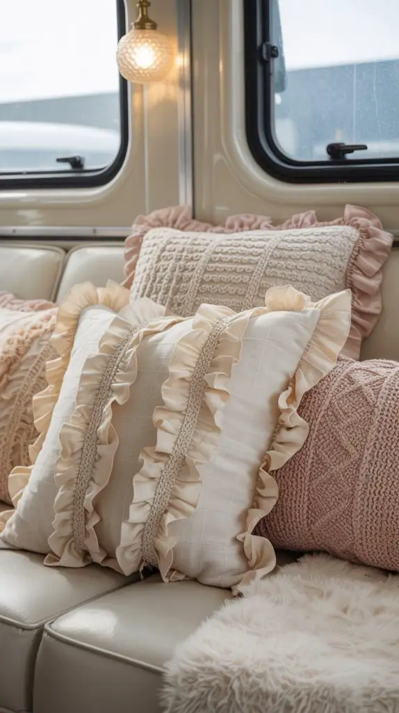 PRO TIP: To make storage and cleaning easier, sew your own ruffled pillow covers or buy standard sizes and use an envelope closure in the back. This allows you to easily remove them for washing and to compactly store the inserts when not in use, saving precious space.