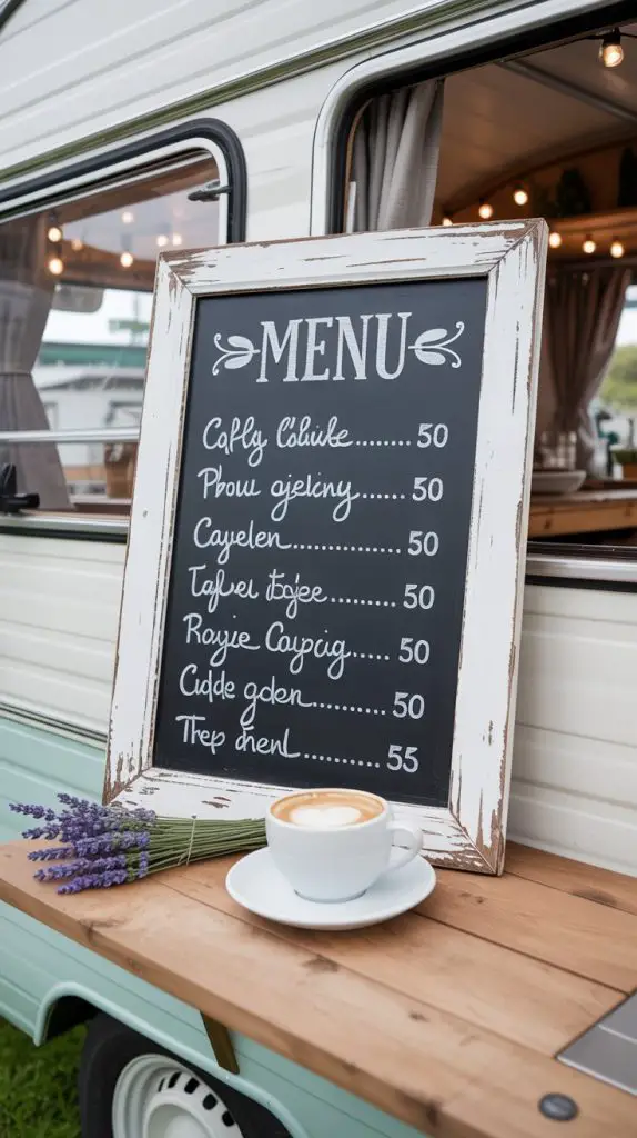 Add a touch of rustic cafe charm with a small, framed chalkboard. The frame is ornate and painted in distressed white, while the board itself is a deep slate gray. Use a white chalk marker to elegantly script the day’s menu, a favorite quote, or the name of your next destination. This personalizes your space and adds a fun, interactive element.