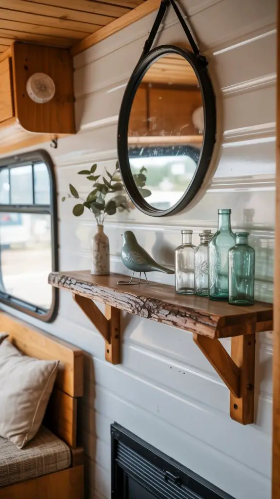Install a single, floating wooden shelf to act as a faux mantel. The shelf is made from a thick, reclaimed wood plank with a live edge and a dark, weathered finish. It’s styled as a focal point with a small, round mirror hanging above it, and a collection of vintage bottles, a small clock, and a ceramic bird figurine arranged on top.