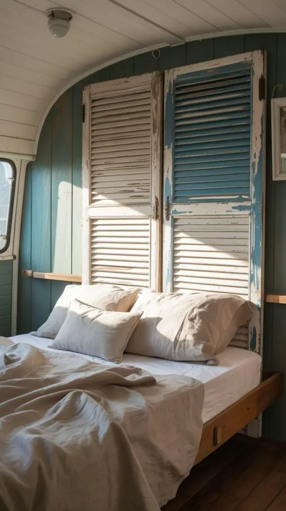 Create a stunning, custom headboard by repurposing an old wooden window shutter. The shutter is wide, with peeling paint in soft white and pale blue, leaning against the wall behind the bed. Its louvres or flat panel design adds significant architectural interest and height, making the sleeping area a defined and elegant focal point.